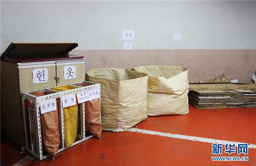 在韩国首尔,主妇金莲心的家里摆放着四袋不同种类的垃圾(6月4日摄)。目前在韩国,垃圾分为食物垃圾、可回收垃圾、一般垃圾、废旧家电等类型。居民在处理食物垃圾和难以回收利用的一般垃圾时,必须购买相应的垃圾袋装好放在指定位置才能丢弃。(新华社记者姚琪琳摄)