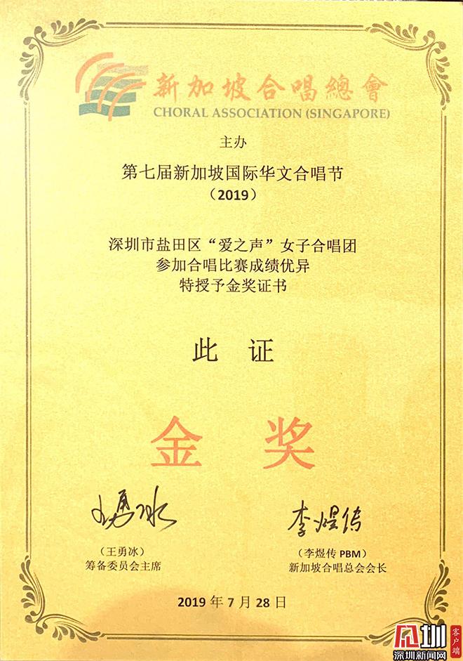 见圳客户端•深圳新闻网讯(记者 潘峰 通讯员 林卓红)日前,在新加坡华族文化中心举行的第七届新加坡华文国际合唱节比赛结果揭晓,盐田区妇联“爱之声”女子合唱团唱响祖国颂歌,在马来西亚、菲律宾、印度尼西亚、日本等10余支队伍中脱颖而出,斩获大赛金奖,现场无伴奏演唱的一曲《九儿》引发观众强烈共鸣,引得不少华人观众潸然泪下。