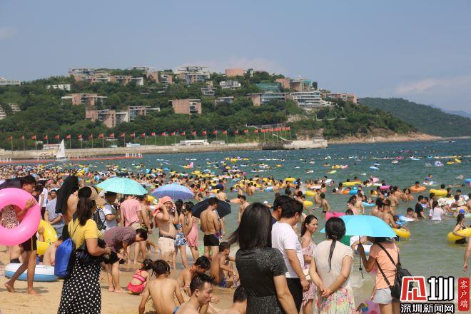 前来游玩的游客朋友大都携家人出行,也有情侣、朋友等相邀前来,在大梅沙海滨公园共度中秋佳节。记者下午2点进入园区,看到巨大的白色遮阳棚下面坐满了密密麻麻的游客,沙滩边有的在五颜六色的遮阳伞下休憩,有的则在海里游泳戏水,一片欢声笑语不断。