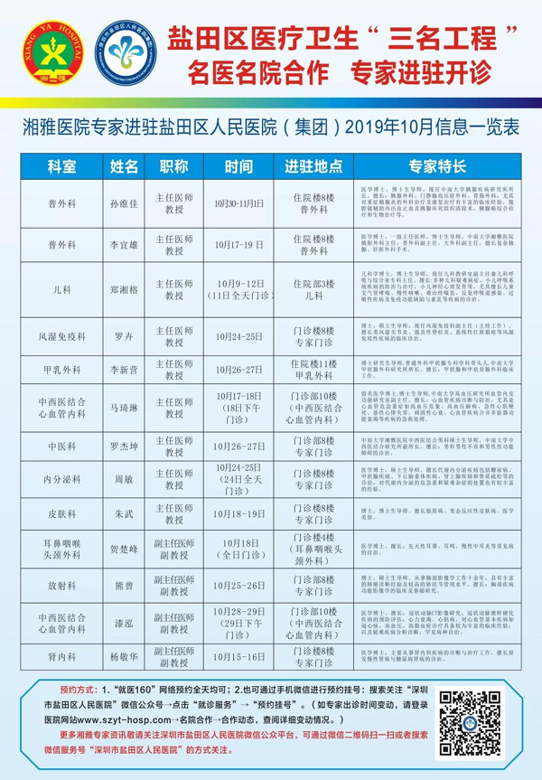 见圳客户端·深圳新闻网讯(记者 陈琳君)近日,记者从盐田区人民医院(集团)获悉,10月份,共有14位来自湘雅医院的专家进驻盐田区人民医院(集团),为市民的健康把脉问诊。市民可根据实际需求和专家出诊情况,通过电话、网站及手机微信公众号挂号等方式预约就诊。