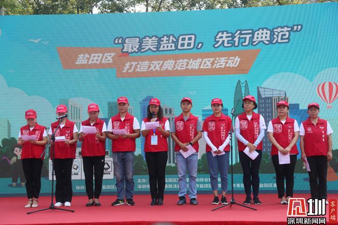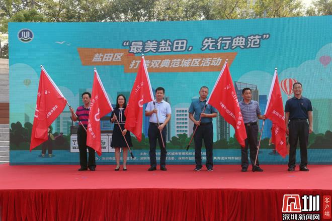 启动仪式结束后,活动现场还进行了授旗仪式。盐田区城市管理和综合执法局局长陈文盛向辖区四个街道及中英街管理局授予“最美盐田先行典范”志愿服务队旗帜,标志着盐田区打造“双典范城区”活动在全区全面铺开。随后,盐田区义工代表上台,倡议居民群众积极参与盐田区打造“双典范城区”活动,共同为盐田区“打造生活垃圾减量分类典范城区”“打造最干净城区典范”献力。