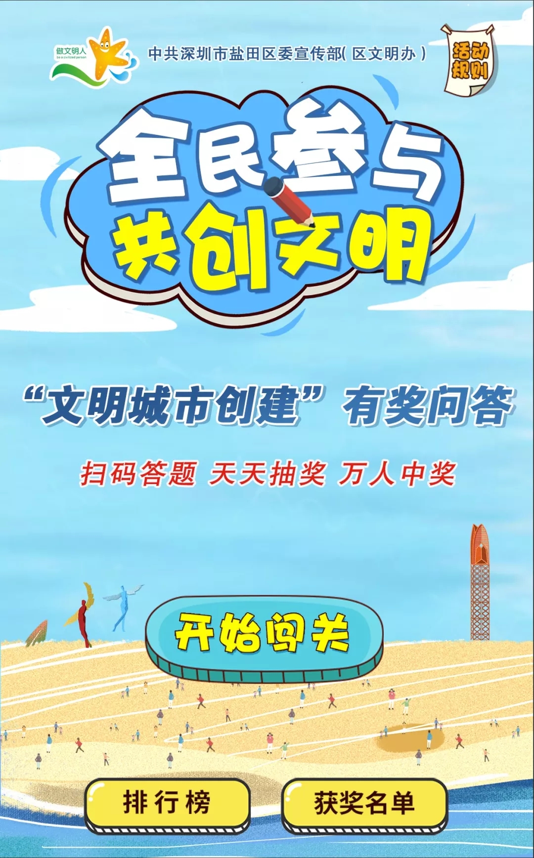 见圳客户端•深圳新闻网讯(记者 邓雪婷 钟汝芳)创建文明城市工作已经进入冲刺阶段,为推进创建全国文明城市工作深入开展,调动广大市民参与创建全国文明城市的积极性,不断提高市民对文明创建的知晓率、参与率和支持率,2019年10月31日18时起至年底,盐田区推出文明创建有奖问答活动,每天最高将发放10000个微信红包。市民每天可参与答题,挑战成功即可参与抽取现金红包,答题拿奖还能涨知识。