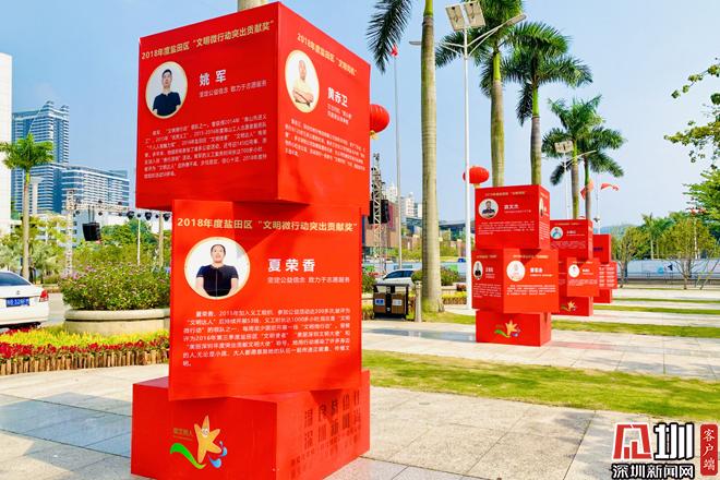 据区文明办相关负责人介绍,区文明办在盐田区政府行政文化广场,设计制作了“身边榜样前行力量”主题的柱体造型宣传景观,以红色为基调,展示2018年度“文明达人”“文明司机”“‘文明微行动’突出贡献奖”获得者的照片和先进事迹,及市民文明手册、创文宣传标语等内容,用通俗易懂的视觉语言,传递着新时代文明理念和社会正能量。