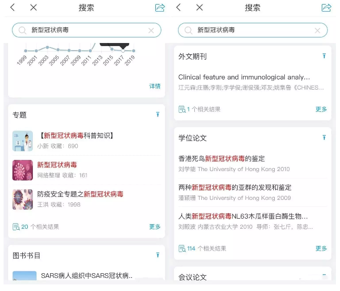 例如:在搜索框中输入检索词:新型冠状病毒,即可获得所有该关键词的检索结果,包括研究趋势、专题汇总、学术视频、电子书、期刊文章、学位论文等多种文献类型。