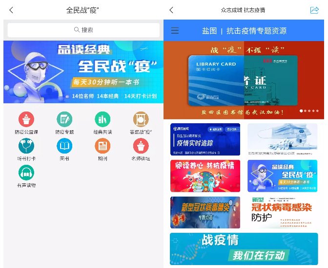 疫情期间,该图书馆联合各资源商推出了全部读者可以参与的各种活动!全民战疫和众志成城抗击疫情活动,点击APP里面的模块,即可参与。