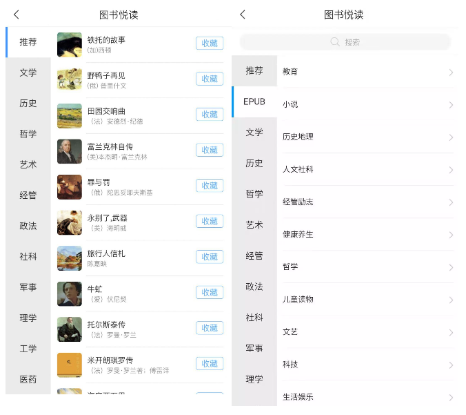 在“图书悦读”应用中,可以直接获取图书,进行阅读。不管是文学小说,还是养生知识,或是专业经典,都可以尽数拥有。在线图书可以收藏在文件夹中,也可以评论点赞、转发分享,与亲朋好友共读好书。