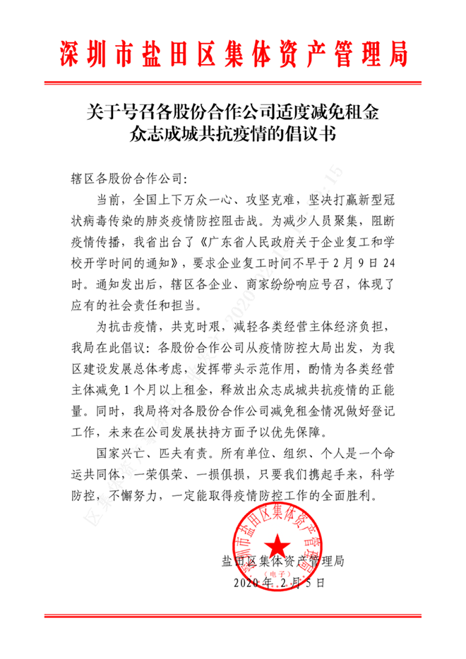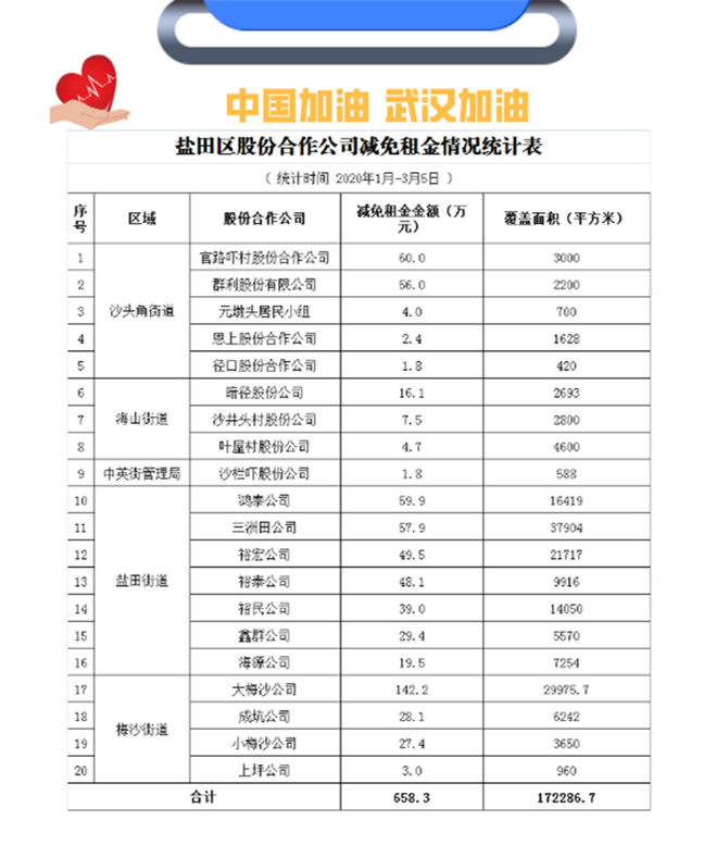 2月5日,区国资局发出《关于号召各股份合作公司适度减免租金众志成城共抗疫情的倡议书》,2月11日起,各街道办陆续召开股份合作公司适度减免租金共抗疫情动员会。截至3月5日,辖区18家股份合作公司、1家集体控股企业、1家居民小组为辖区各类经营主体减免租金等共计658.3万元,涉及物业172286.7平方米。其中沙头角街道办辖区的官路吓村股份合作公司、群利股份有限公司分别减免租金60万元和56万元,盐田街道办辖区的鸿泰实业有限公司、三洲田实业有限公司分别减免租金59.9万元和57.9万元,梅沙街道办辖区的大梅沙公司减免租金142.2万元,成为扶持经济率先垂范的“排头兵”。