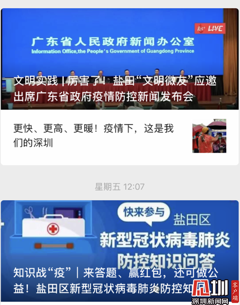 彩铃战“疫”、“艺”同战“疫”、户外战“疫”、文明战“疫”……疫情当前,盐田区委宣传部统筹盐田区融媒体平台创新宣传形式,营造了浓厚的全民抗疫氛围,推出“四大举措”。联合移动公司开通疫情防控宣传视频彩铃业务,以形式活泼、通俗易懂的方式开展疫情防控宣传,增强群众自我防范意识;推出原创战“疫”MV一首、原创快板一首、书画作品86幅、原创文学作品30篇,用文化的力量展现“硬核”形象,致敬奋战在抗击疫情第一线的各行业工作人员,鼓舞大家共同抗疫防疫的信心和决心;充分利用宣传栏、横幅标语、电子屏等平台,张贴防控疫情的公益宣传画1万余张,派发防控疫情宣传单张近3万张,张贴防控疫情的公益宣传画1万余张,派发防控疫情宣传单张近3万张,在辖区电子显示屏滚动刊播防控疫情的公益宣传片、宣传画、宣传标语42万余次,利用城管执法车辆在辖区主次干道97个移动宣传点位每天不间断播放防控疫情的音频,倡导动员辖区各物业管理处在小区门口对小区每日防疫防控情况进行公示,实现社会宣传全覆盖;发挥“文明微友”的作用,组织小分队深入到社区、重要卡点、场所,全力配合社区、有关部门有序开展入户走访调查、公共秩序维护、防护知识宣传、医疗后勤保障、捐款捐物、便民利民、社会帮扶等志愿服务活动。