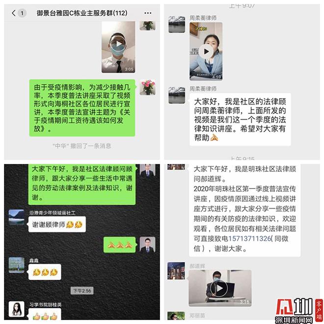 见圳客户端·深圳新闻网讯(记者 陈琳君 通讯员 李玉玲)社区是疫情防控的最前线,在盐田区司法局的指导下,连日来,盐田街道组织6位社区法律顾问积极投入疫情防控阻击战,采用在线微视频的方式开展以“依法防疫检疫,善意履行公民义务”为主题的法治讲座,提高社区居民的法律意识和维权意识,织密社会防疫安全网,筑牢疫情防护人民防线。