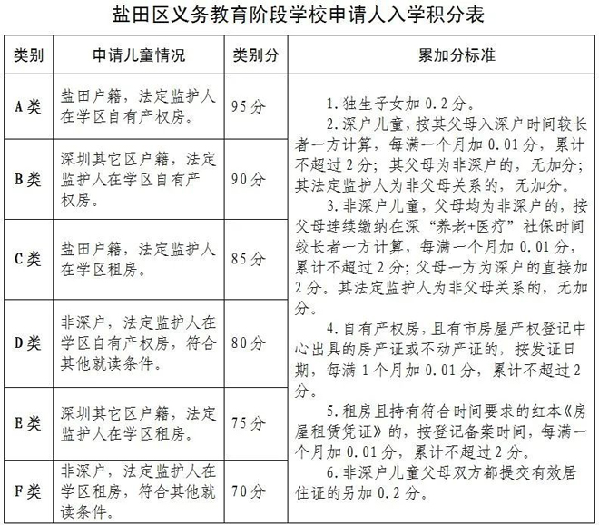 此外,盐田区重新修订了《盐田区义务教育阶段学校申请人入学积分表》,全区义务教育阶段学校招生继续实行积分入学。申请人所得积分为“类别分+累加分”,按积分从高到低录满为止。在出现同分情况下,深户儿童按儿童入深圳户籍时间较长者一方的先后顺序排位,录满为止,非深户儿童按照儿童父母连续缴纳深圳社保时间较长者一方的长短排位,录满为止。其中,“类别分”按申请儿童户籍和监护人住房情况,划分为A、B、C、D、E、F六个学位申请类别。在积分认定方面,申请人的申请信息经学校初审后,教育部门实行联网核验信息,根据核验结果认定积分。