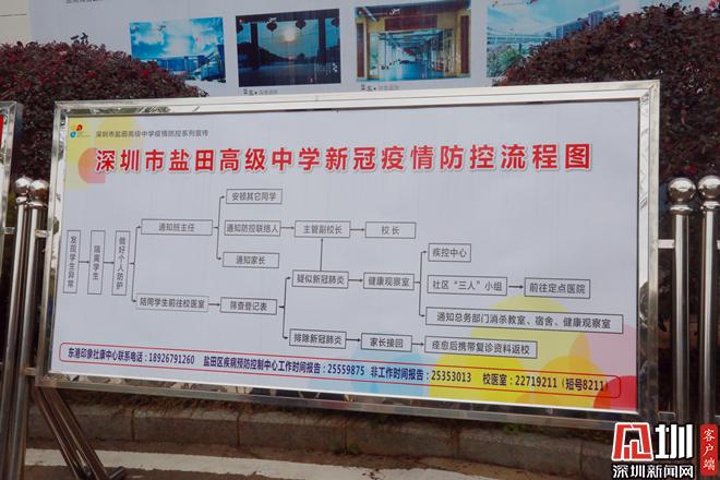 在盐田高级中学后门入口处,记者看到,校门前已用铁马围出一大片空地,空地右前方则留有一个约两米宽的入口,旁边立着标有“返校流程”的指示牌。从入口处向里望去,可清楚看到体温测量、手部卫生、上交健康卡、体温异常复查处和体温异常学生离校通道等点位井井有条分布,整个入校流程细致严谨、清晰明了。学校安全管理处相关负责人告诉记者,返校复学期间,学校仅保留该处一个入口作为学生通道,在顺利经过体温测量、手部消毒、上交健康卡三道关卡后,学生方可入校。