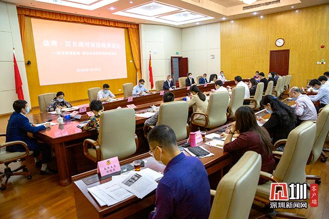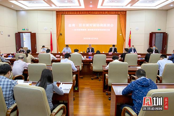 见圳客户端•深圳新闻网讯(记者 潘峰)2020年4月28日上午,由盐田区政府、区政协共同主办的“盐商•区长面对面协商座谈会”召开,区长杨军与12名盐商代表围绕“应对疫情影响,推动盐田经济高质量发展”主题展开协商交流。会议由区政协主席武威主持,区领导李小宁、罗毅、邓德良、周丽出席会议。