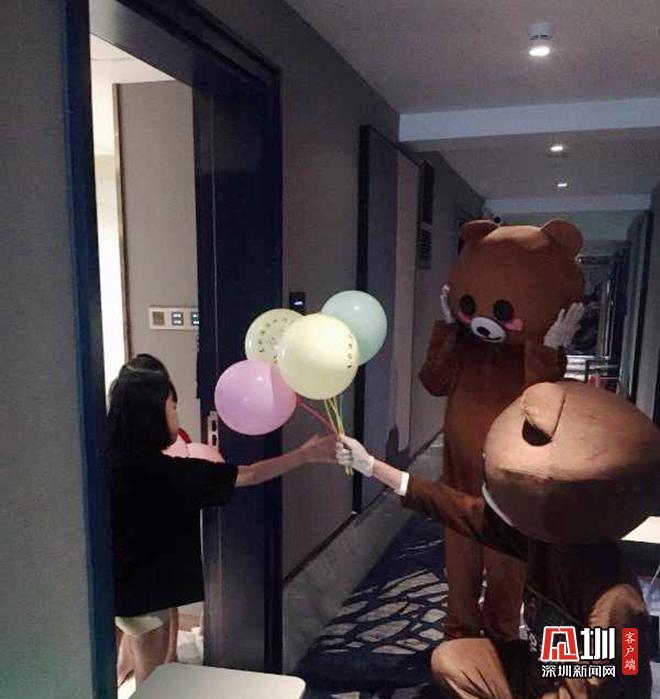 15日上午,在盐田健康驿站内,身着卡通人偶服装的工作人员,正推着装满玩具熊和鲜花的小推车,挨个房间为旅客赠送惊喜。“为了让客人在隔离期间感受到家的温馨,工作人员会在房间摆放鲜花,营造温馨的居住环境,还会在旅客生日时送生日蛋糕,不定时给小孩送气球和玩具。”该隔离点相关负责人说道。
