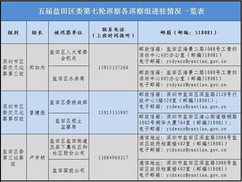 见圳客户端.深圳新闻网讯(记者 郑创彬)5月21日,记者从盐田区委巡察办获悉,根据市委和区委巡察工作统一部署,五届盐田区委第七轮巡察于5月14日启动。本轮巡察共设立3个巡察组,每组巡察2个单位,将对区委统战部、区人大常委会机关、区水务局、区规土监察局、盐田街道、盐田国投公司6个单位党组织开展巡察。其中,区人大常委会机关和区水务局由深圳市区委交叉巡察第三组负责巡察,区委统战部和区规土监察局由深圳市区委交叉巡察第四组负责巡察。目前,各巡察组已全部完成进驻并召开动员会,巡察监督工作全面展开。