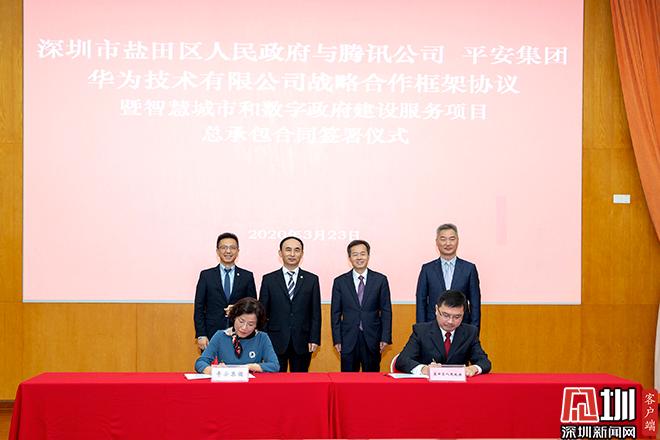 见圳客户端•深圳新闻网讯(记者 潘峰)2020年3月23日上午,盐田区人民政府正式与腾讯公司、平安集团、华为公司签署战略合作框架协议暨智慧城市和“数字政府”建设服务项目总承包合同。这标志着,未来三年,由华为、平安、腾讯“三巨头”组成的深企科技联合体,将运用大数据、人工智能、5G、区块链等先进技术增强数字经济新动能,拓展数字生活新内涵,打造国际一流智慧城市样板,助力盐田区加快建成宜居宜业宜游的现代化国际化创新型滨海城区。盐田区委书记陈清,区委副书记、区长杨军,区领导梁景海、武威、李小宁、乔宏彬、罗毅,以及腾讯公司、平安集团、华为技术有限公司等企业相关负责人出席签约仪式。