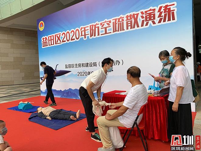 防空疏散演练主要内容是模拟防空警报鸣响时,居民应如何快速疏散到就近的人防工程内;向居民普及人防工程的基础知识和功能区;开展居民互动活动,科普人防常识,展示心肺复苏和伤者包扎等应急事件的处置和演示。在人防工程内,结合疏散演练,主办方还现场教学,介绍了盐田现代产业服务中心人防工程的基本功能。为了增强空袭演练的真实性,在人防工程遮蔽区,主办方还设置了临时指挥所、人员集结区、心理疏导区、物资发放区、医疗救护区、干厕等。