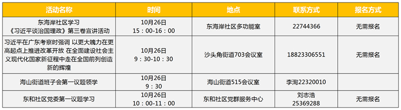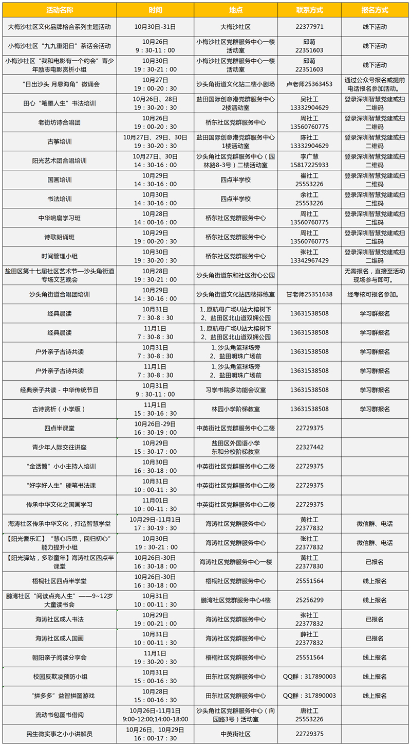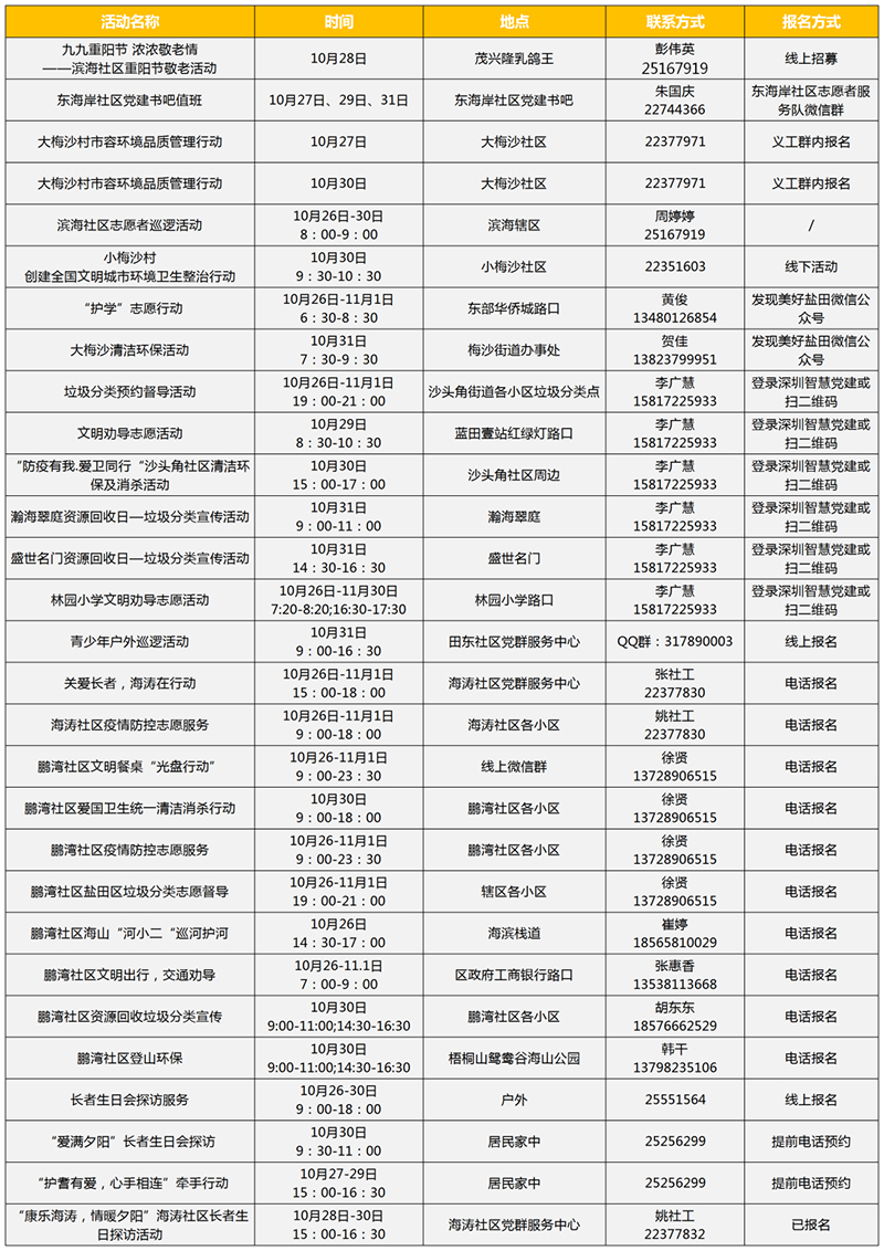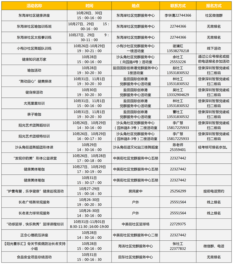 见圳客户端•深圳新闻网讯(记者 潘峰 钟汝芳)2020年10月27日,记者从盐田区获悉,最新一周新时代文明实践活动新鲜出炉啦!本期内容颇为丰富,包括理论宣讲、教育服务、文化服务、健体服务、志愿服务等项目,辖区居民可根据需求,一边享受各类文化服务,一边参与到文明实践活动中来。