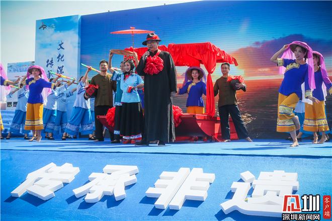 活动在喜庆的醒狮表演中拉开帷幕。合唱歌曲《翡翠岛》歌舞《阿嫂好靓一对眉》《盐田疍家婚俗》等轮番上演,为现场观众率先奉上疍家文化盛宴。随后,数十名身着传统蓝色疍家服饰的妇女分成两列,手持桨板开始疍家渔民娶亲表演。据了解,旧时疍家人以舟楫而居,以捕鱼为生,婚嫁仪式都在海上举行,由此形成了独特的“疍家婚俗”。如今疍家人早已上岸居住,昔日的渔民文化已融入到现代化的城市中,以往的海上迎亲也逐渐演变成如今以“花龙舟、划旱船”的形式并一直传承至今。