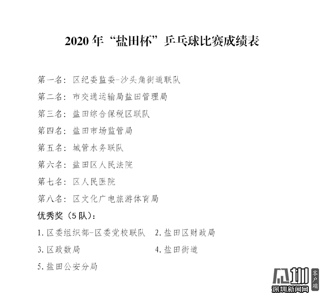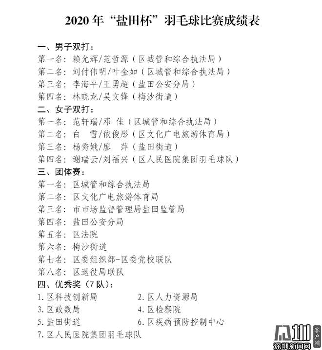 见圳客户端·深圳新闻网讯(记者 陈琳君 通讯员 张冠冠)2020年12月7日晚,由盐田区直机关工委、区文化广电旅游体育局主办的2020年“盐田杯”羽毛球、乒乓球比赛在沙头角体育馆、盐田老干中心精彩收官。