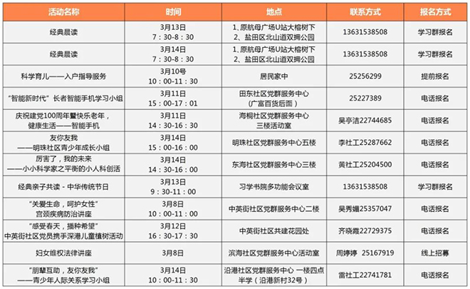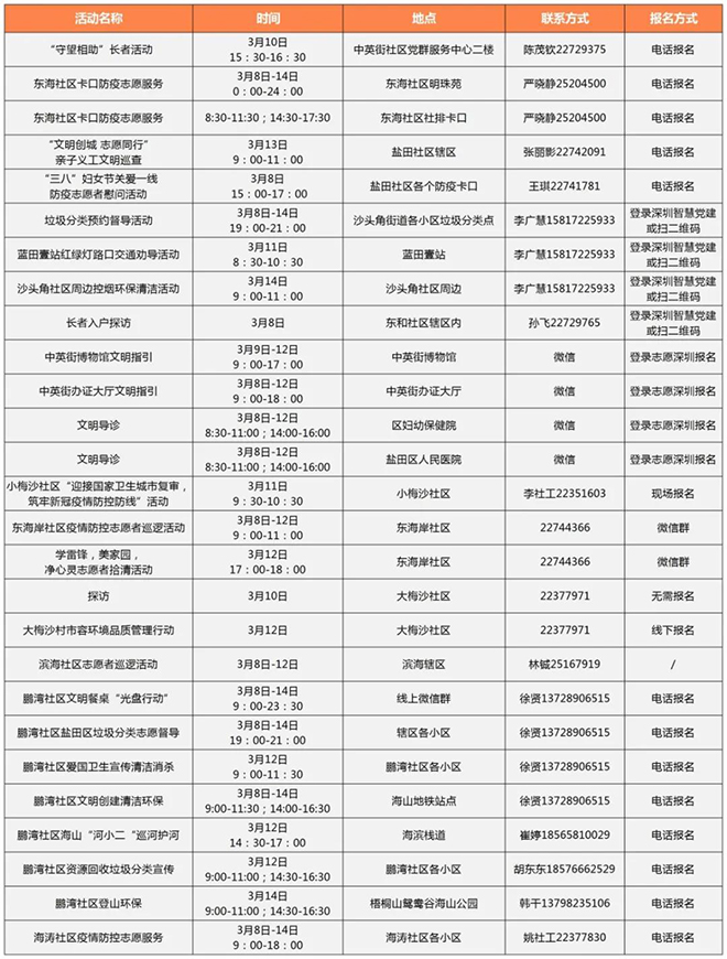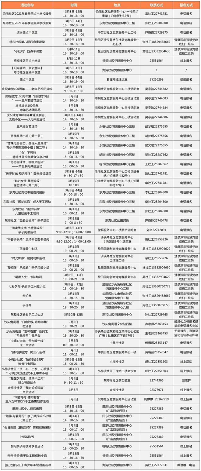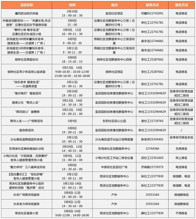 见圳客户端•深圳新闻网讯(记者 钟汝芳)2021年3月8日,记者从盐田区获悉,最新一周新时代文明实践活动新鲜出炉啦!本期内容颇为丰富,包括理论宣讲、教育服务、文化服务、健体服务、志愿服务等项目,辖区居民可根据需求,享受各类文化服务,参与到文明实践活动中来。
