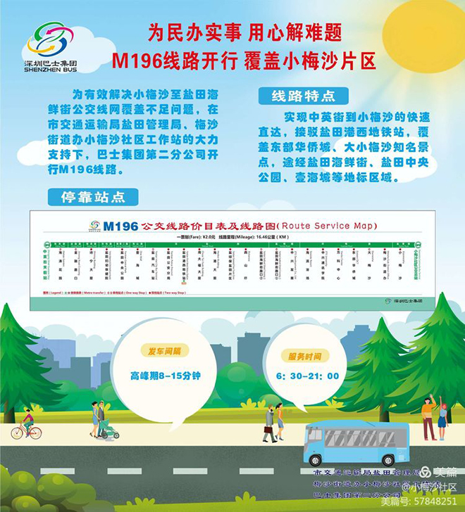 据了解,由于387路公交车线路取消,小梅沙至盐田海鲜街片区无直达车辆,影响了梅沙片区上万居民和游客出行。无车直达、出行成本增加等诉求,一度成为该片区的民生热点问题。深圳市生态环境局督查处党支部、梅沙街道办等部门多次以召开现场会、协调会的方式解决小梅沙至盐田海鲜街公交线网覆盖不足问题。最终,通过各方努力,M196公交车将于4月11日正式启动运营,彻底解决该片区居民和游客出行难问题。