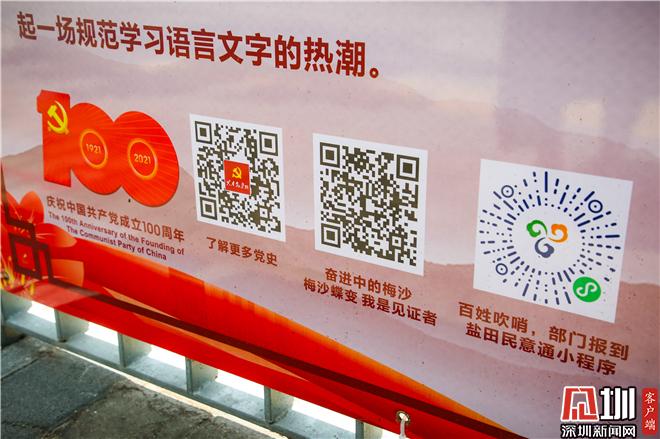 尤其是,在每个展板的左下角,还附有3个二维码,分别导向到“百年瞬间——共产党员网”“奋进中的梅沙:梅沙蝶变我是见证者”“盐田民意通”等专栏。广大党员群众在观看展板的同时,还可扫描二维码了解更多的党史知识和梅沙近年来的发展巨变,以及通过“盐田民意通”小程序反映“急难愁盼”问题。这也是盐田区坚持以人民为中心,将“七个一百”活动同解决群众“急难愁盼”问题结合起来,立足为民办实事、群众得实惠的生动体现。