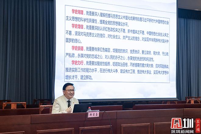 见圳客户端·深圳新闻网讯(记者 潘峰)2021年5月13日,盐田区举办党史学习教育市委宣讲团宣讲报告会暨区委理论学习中心组(扩大)学习会,邀请党史学习教育市委宣讲团成员、市委宣传部二级巡视员、深圳创新创意设计发展办公室主任韩望喜作党史学习教育专题宣讲报告。区委理论学习中心组成员以及区委各部门,区直、驻区各单位主要负责人出席会议。