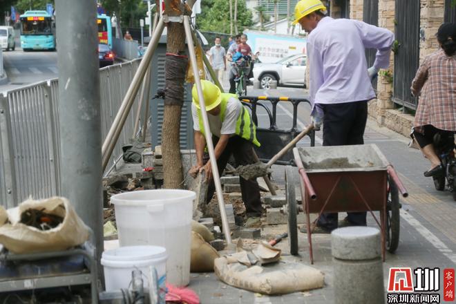 “早上7点我们就开始工作了,天气虽然热,但是看到苗木健康成长,给城市增添了绿色,还是十分欣慰的。”在盐田区梧桐路,记者看到,有园林工人正在沿路补种香樟树,并用水泥修复树池。尽管戴着帽子,但一张张被晒得黝黑的脸庞上,豆大的汗珠依然不停地往下掉。
