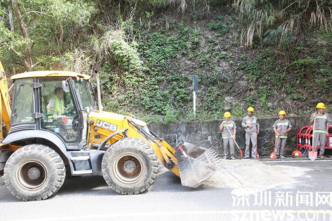“报告指挥部,盐三线K17+600处路段发生边坡水毁塌方,坍塌量约60立方米。”深圳市交通运输局盐田管理局应急指挥部接到险情报告后,立即启动应急预案,迅速投入抢险工作。演练现场,巡查组利用车上现有反光锥、警示带做好现场警示和交通疏导,引导过往车辆绕行。应急疏散组立即对事故现场进行交通安全设施围挡,封闭车道,疏导交通。技术组立即着手对现场情况进行勘查,认为该处边坡是由于土质松软、雨水冲刷破坏边坡结构导致边坡水毁塌方,现场边坡不存在进一步塌方危险,并提出需对道路封闭禁行,先行清除坍塌土方。最后,应急抢险队伍装载大型机械设备赶赴抢险现场,经过紧张有序的抢险工作,完成了抢险任务。