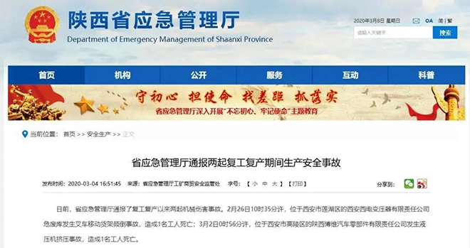 2020年2月26日,位于西安市莲湖区的西安西电变压器有限责任公司危废库发生叉车移动货架倾倒事故,造成1名工人死亡。