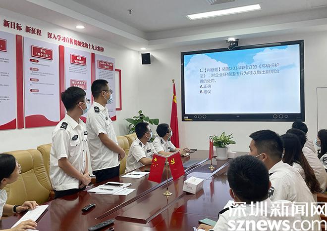 本次执法比武竞赛活动分为预赛与主赛两个赛段。预赛于9月27日举行,在比武竞赛开始前,执法科负责人为大家系统讲授生态环境执法查处要点、执法规范化与执法技能相关知识,剖析执法中的实际问题。接下来,参赛人员分为五个小组参与“知识竞赛”和“案例分析”两个比赛环节。“知识竞赛”兼具专业性与趣味性,各组派员抽签随机选择套题,题目涉及单选、多选、填空等多种题型,题目内容涵盖环境方面的方针政策、法律法规和执法要点。在“案例分析”环节中,各组选出代表,结合盐田区执法监管的重点,分别选取工业废水、VOC废气、汽修行业危险废物、餐饮油烟和智慧监管等五个方面,以执法查处案例为典型,讲解交流当前盐田区在环境执法监管中存在的主要问题和解决方案,以案释法,以案学法。该环节主要考察各组案件查办、经验启示总结的能力,现场根据各组表现给予打分。