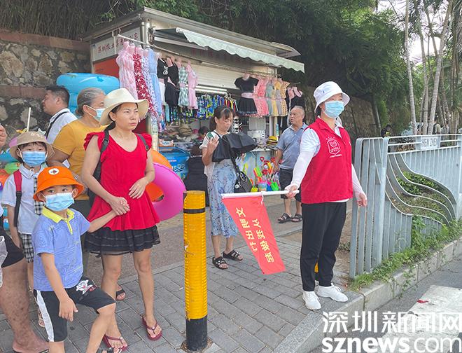 与此同时,盐田团区委也积极动员志愿力量,全面助力做好梅沙片区假期治安、交通保障工作,在大梅沙海滨公园开展文明旅游志愿服务,组织40余名志愿者在太阳广场、月亮广场两个出入口,做好出入园咨询指引、人流疏导、乘车秩序维持等志愿服务,同时配合交警部门在红绿灯路口进行文明交通劝导,引导游客自觉走斑马线过马路,安全出行。参与志愿服务达280人次,服务时长约1400小时。在大梅沙海滨公园城市服务U站,志愿者还向游客提供便民饮水、充电、药箱、指引等服务,对接客服中心协助游客寻找丢失物品。