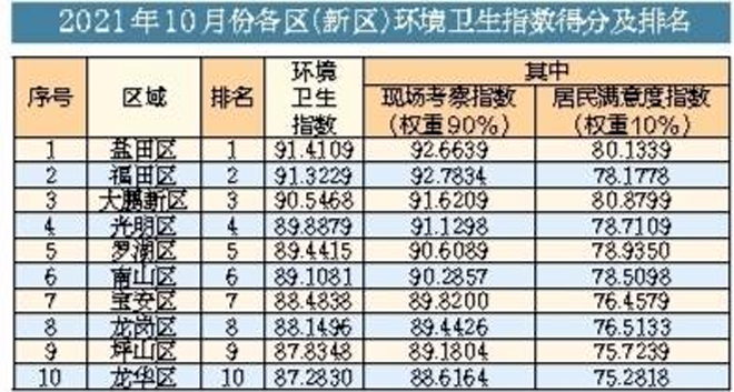 读特客户端•深圳新闻网2021年11月8日讯(记者 陈琳君 邓雪婷)近日,深圳市城市管理和综合执法局发布10月份全市环境卫生指数测评成绩,继9月位列全市环境卫生指数“榜首”后,盐田区“胜不骄”,再以91.41分的总成绩成为全市第一,并以89.70分获得城中村环境指数第二名。同时,在10月份公厕环境指数测评结果中,盐田区得分95.21分,较上月进步0.54分,排名也由第2名上升到第1名,其中,保洁管理指数以66.70分的成绩继续保持全市排名第一。