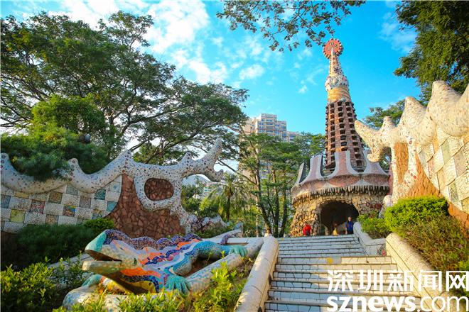 蜿蜒的阶梯,拼接的色块瓷砖,波浪形坐凳,各种色彩、形状碰撞,充满想象与艺术气息。高迪风建筑的艺术塔内还藏有的螺旋楼梯,旋转而上,仿若步入一座古堡,塔顶依旧是拼接而成的七彩斑斓世界。