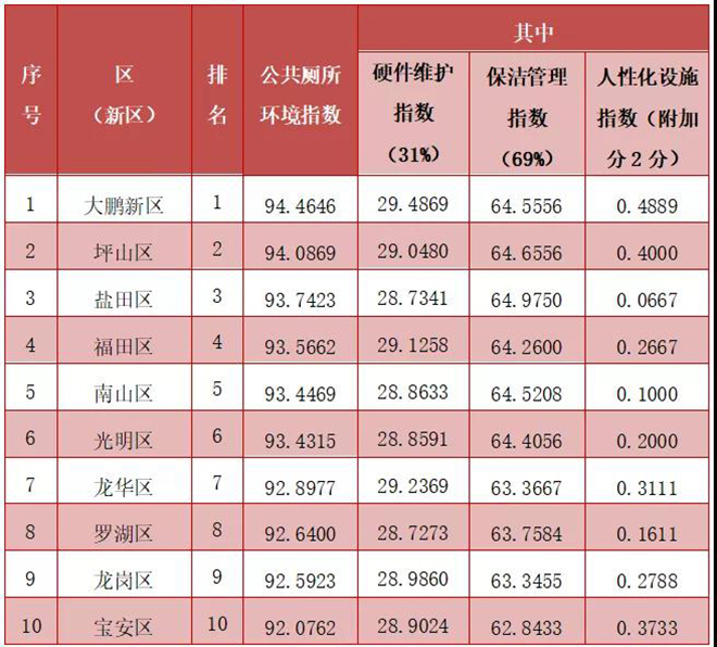 公共厕所一直是市容环境的痛点、难点,值得注意的是,市城市管理和综合执法局同步发布了2021年12月份公厕环境指数测评结果,各区排名榜上,盐田区排名前三位。据了解,一直以来,盐田区把“厕所革命”作为一项政治任务,为全方位提高辖区公厕的管理水平和服务质量出实招、上硬招,积极推动学校、商超、旅游景点、公交场站等短板社会公厕升级改造工作。同时全力推进辖区社会公厕进行新一轮升级改造,加快市政公厕升级改造和环保公厕的改扩建进度,大力开展市政公厕配套设施修缮工程,持续在公园绿道上打造了一批高标高质、简约美观、通风舒适、人性友好的具备“盐系”网红公厕群,让“厕所革命”的理念在辖区落地生根,极大改善了群众如厕体验。目前,盐田区已基本完成2021年的公厕改造或新建任务。