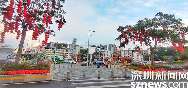 深盐路,行道树和路灯灯杆被灯笼串等元素装饰一新,整条道路看上去非常喜庆。