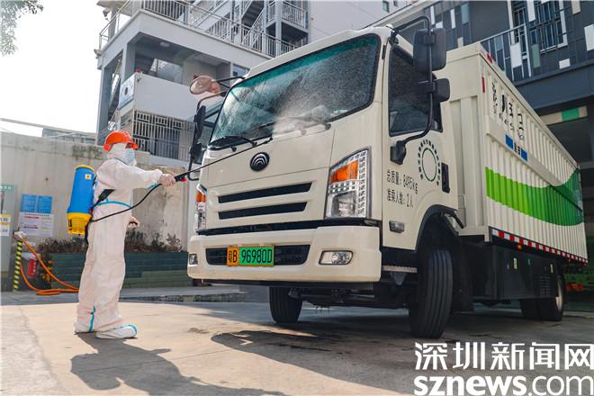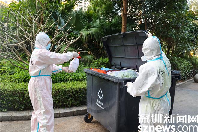 “大家注意安全,做好消毒消杀!”中午时分,在熟练地穿戴好防护服、戴好口罩、手套后,环卫师傅曾龙辉驾驶着垃圾清运车缓缓驶入管控区内。在中英街一号小区垃圾集中存放点,曾龙辉和自己的老搭档王祖明熟练地用随身携带的消毒药剂和器具,对垃圾桶内外及周边场所进行消毒消杀,并将垃圾桶顺利运至转运车上。