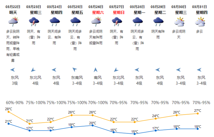 其中,22日夜间到23日有雷阵雨,部分时间雨势大,雷雨时伴有6-7级短时阵风,气温明显下降,天气转凉;24-25日多云间阴天,间中有阵雨或雷阵雨,气温逐日回升;26-28日阴天间多云有(雷)阵雨,气温再度下降。
