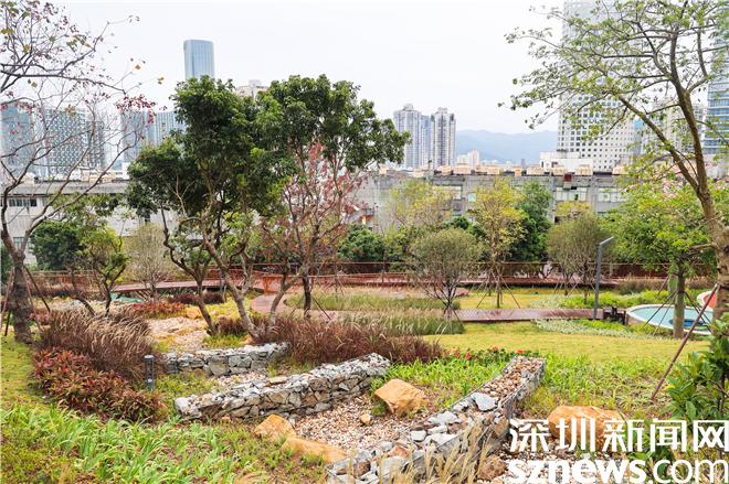 沿着碧桐道拾级而上,大约行走100米距离,沙头角公园的标识便映入眼帘,从主入口进入公园,可见一条花坡特色观赏带、数条蜿蜒曲折的旱溪、几个由特色长椅组成的小型集散空间,吸引了不少市民在此驻足休憩。值得一提的是,沙头角公园在建设时还结合海绵城市理念,根据地形采用天然石块打造了旱溪景观,雨季时,水流潺潺,石块若隐若现,宛如溪流上的珍珠;旱季时,形态各异的石块自然裸露于干涸的河床,与周围错落有致的植物呈现别样美景。