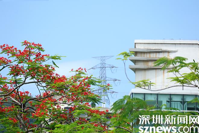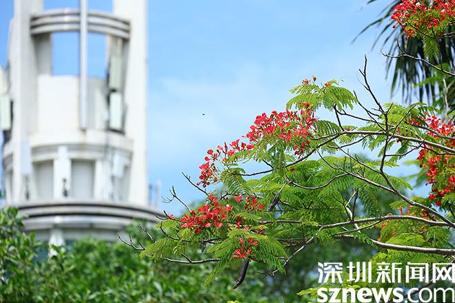 读特客户端•深圳新闻网2022年5月20日讯(记者 黎阳 邓雪婷 实习生 魏紫萱 龙兆洋)每年5月份,是凤凰花盛放的季节,鲜红的花朵红似火焰,给盐田增添了一道道亮丽的风景线。凤凰木取名于“叶如飞凰之羽,花若丹凤之冠”,它的叶片细小,树冠较大,开花时十分漂亮,姿态优雅。在盐田的大街小巷,一个不经意的抬头,或许就能见到凤凰花探出的簇簇火红,栖息在翠绿色的枝叶上,灿烂又热烈。