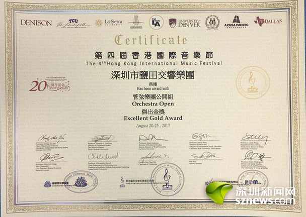 在本届香港国际音乐节上,盐田交响乐团在音乐节中表现更是出彩,他们在香港国际音乐节开幕式音乐会上首次与国际大咖联袂演出,获得了特区政府官员和来自世界各国评委专家的高度赞誉和现场观众的一致好评。比赛中,他们用一曲高难度的《节日序曲》征服了现场的国际评委,获得了全场最高分,一举斩获成人组管弦乐团杰出金奖。