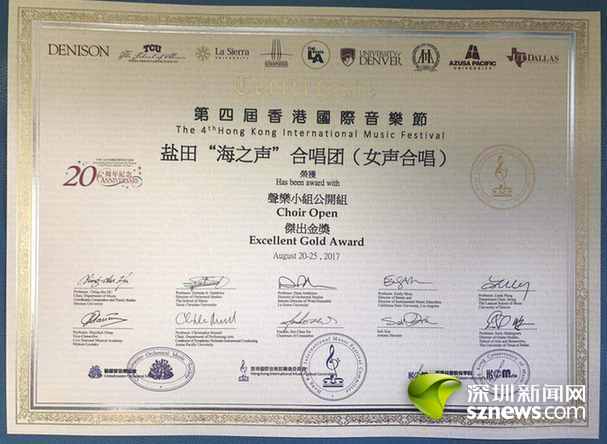 深圳新闻网讯(记者 郑创彬)在第六届新加坡国际华文合唱节获得金奖载誉归来的盐田“海之声”合唱团再次传来好消息。8月25日,记者从盐田区获悉,该合唱团(混声合唱、女声合唱)在“第四届香港国际音乐节”上凭借着精湛的演绎和出色的表现力压群雄,最终在来自世界各地近四千名优胜者中脱颖而出,蝉联成年组声乐金奖,缔造了一个月内参加两个国际比赛横扫金牌的传奇。