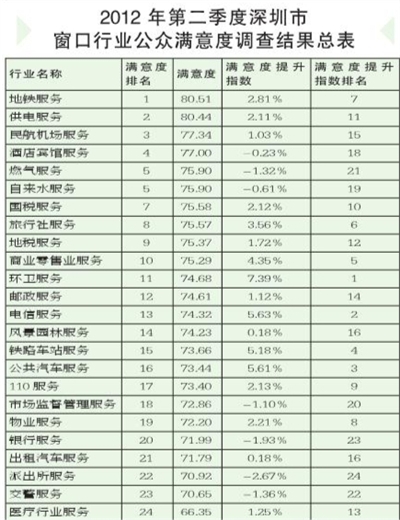第二季度对24个窗口行业的满意度调查中,地铁服务排名从上季度的第2跃居第1,而上季度排名居首的供电服务此轮位居第2。满意度提升指数排名前五名的是环卫服务、电信服务、公共汽车服务、铁路车站服务、商业零售业服务,有7个行业满意度提升指数为负数。满意率(满意率是指接受过某行业服务的人口中,对该行业的服务表示“基本满意”以上的人所占百分比)方面,抽样调查显示,24个窗口行业总体满意率为96.44%,比2012年第一季度提高了4.49%,比2011年同期提高了0.51%。24个窗口行业中,满意率90%以上的有22个行业,其中,酒店宾馆服务和自来水服务满意率为100%;只有银行服务、110服务两个行业的满意率在90%以下,分别为88.35%和81.82%。