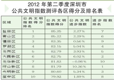 据了解,公共文明测评由四个项目构成,包括公共环境、公共秩序、人际交往、公益行动。在第二季度的各测评项目中,公益行动得分率最高,其次是人际交往,第三是公共秩序,最低的是公共环境。根据得分,我市10个行政区、新区的排名依次是:盐田区、南山区、福田区、罗湖区、龙岗区、大鹏新区、龙华新区、坪山新区、光明新区、宝安区。公共文明进步指数最高的是坪山新区,最低的是龙华新区,也是各区中唯一进步指数为负的一个区。