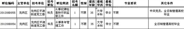 深圳新闻网8月30日讯(记者 王丹丹)8月30日,深圳市考试院公布新一轮公务员招考结果,20177人竞争237个公务员“饭碗”,可谓“百里挑一”。编号为201208D055的龙岗区平湖街道党工委科员成为最热门职位,1301人竞争1个岗位。记者从职位描述中看到,这两个岗位的职责分别为从事纪检行政监察和从事青年管理工作。