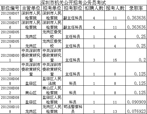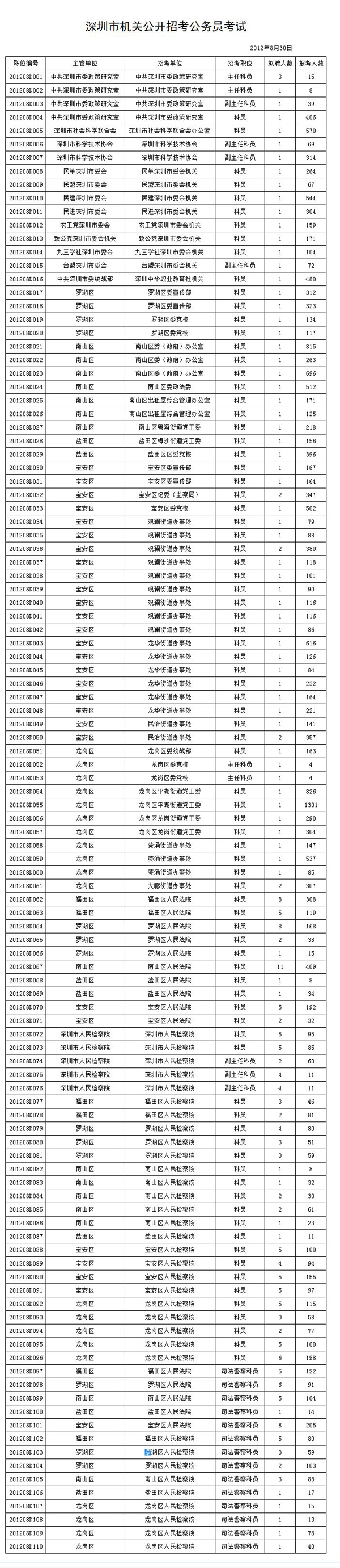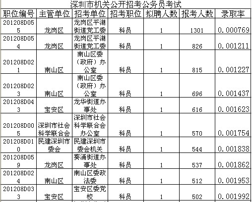 本次招考,深圳市公开招考公务员237人,共有20177人报考。根据统计,深圳市社会科学联合办公室科员、龙华街道办事处科员等10个职位招考比例超过1:500,其中编号为201208D054和201208D055的龙岗区平湖街道党工委科员成为本次报考最热门的两个职位,招报比例分别为1:826和1:1301,南山区委区政府办公室共招收3名科员,共有1774人报考。