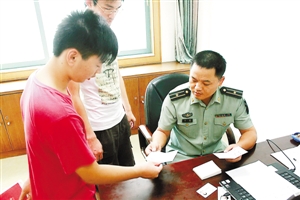 广东省人民政府征兵办要求,凡年满18周岁至24周岁男性公民必须到户籍所在地的兵役机关进行兵役登记,填写并领取《广东省公民兵役证》。广东籍新生就读广东境内各大中院校(包括职高、技校),入学报到时必须携带该证件。连日来,辖区适龄青年踊跃进行兵役登记。图为盐田区征兵办人员为适龄青年办理《公民兵役证》。