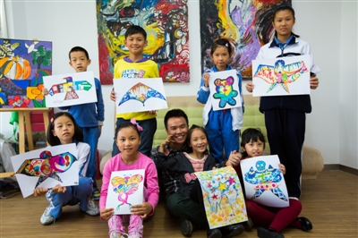 昨天,有一对姐弟的作品同时入选,他们是来自园岭小学的陈禧欢、陈天越。弟弟用不同的颜色来表达参赛各国国旗,姐姐则用绚丽的画笔和温暖的色调,表示中国的文化。
