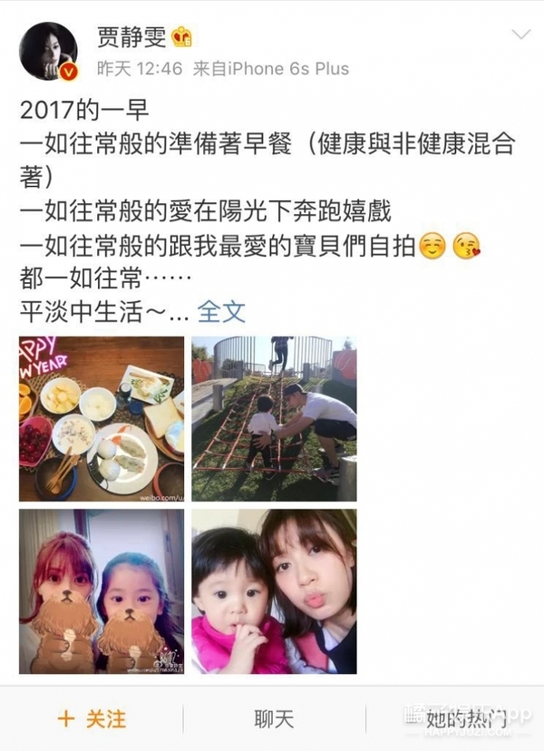 贾静雯昨天发微博分享生活,晒自己的新年第一天,这次不但发了二女儿的皂片,大女儿梧桐妹的正面照也罕见的曝光啦!