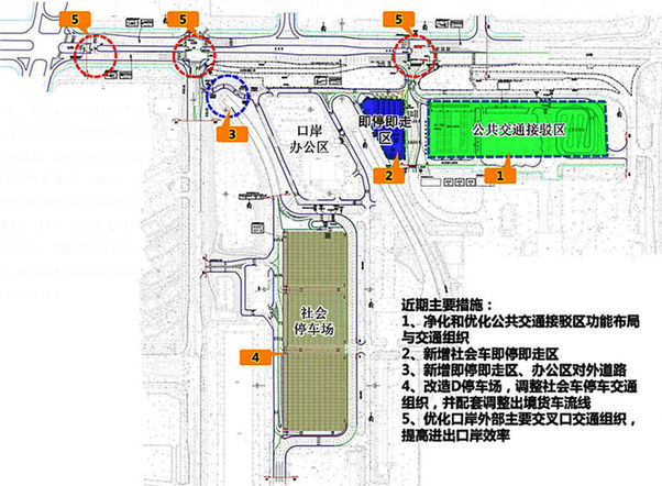 在口岸内部交通组织方面,记者了解到,交通部门将优化出境货车交通流线,调整出境货运交通组织,从原来D停车场西侧道路出境改为从东侧道路出境,避免社会车辆与出境货车通行交织。目前,该项措施作进一步观察评估,待完善相应配套设施设置后启用。